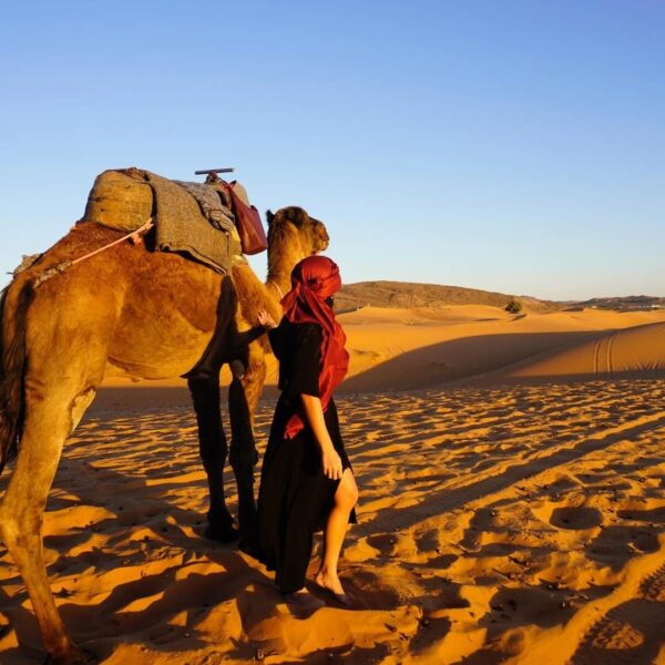 Visita del Mercato di Rissani, culla della dinastia Alawita. Passaggio per Erfoud, famosa per i fossili. Arrivo a Merzouga nel tardo pomeriggio. Trek in dromedario verso il campo nel deserto in mezzo alle dune di Erg Chebbi. Cena con tajine e couscous attorno al fuoco. Musica berbera Gnawa. Notte sotto le stelle del Sahara.